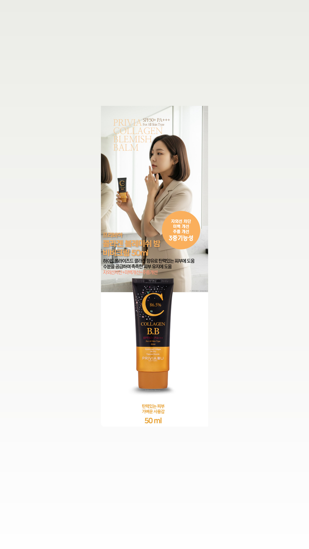 کرم BB کرهای حاوی کلاژن، PRIVIA Collagen Blemish Balm SPF50+ PA+++، محصولی چند منظوره برای مراقبت از پوست صورت و آرایش بیعیب و نقص است. این محصول عملکردهای یک کرم پودر، محافظت در برابر اشعه ماوراء بنفش و مراقبت از پوست را با هم ترکیب میکند و ظاهری سالم و طبیعی به آرایش میبخشد. کرم BB که با نام "BB" نیز شناخته میشود، پوشش یکنواختی ایجاد میکند و عیوب پوست، از جمله جای زخم، لکههای پس از آکنه، جوش و قرمزی را میپوشاند. این کرم پودر مرطوبکننده دارای بافتی سبک است و به راحتی روی پوست پخش میشود و ظاهری درخشان و آراسته به آن میدهد. این کرم پودر حاوی کلاژن است که به کاهش چین و چروک کمک میکند، پوست را عمیقاً آبرسانی و صاف میکند و از هدر رفتن رطوبت جلوگیری میکند. این کرم رنگدانهها را روشن میکند و با تحریک سنتز کلاژن و الاستین طبیعی، اثر ضد پیری دارد. کرم BB دارای اثر روشنکننده است و به صورت رنگی طبیعی و درخشان میدهد. چهره شما طبیعی و یکدست به نظر میرسد. این کرم نه تنها لکههای تیره و سوزش را میپوشاند، بلکه به طور موثری چربی پوست را کاهش میدهد و از براق شدن آن جلوگیری میکند. این کرم BB با محافظت بالا در برابر اشعههای مضر UV و SPF 50+ و PA+++، از پوست در برابر اشعههای مضر UV محافظت میکند و از بروز لکههای پیری جدید، کک و مک و سایر علائم پیری جلوگیری میکند. این امر به ویژه برای کسانی که در مناطقی زندگی میکنند که در معرض آفتاب شدید و سوزان قرار دارند، بسیار مهم است. تیوب بزرگ و راحت آن امکان استفاده طولانی مدت را فراهم میکند. این کرم BB برای انواع پوست، از جمله پوستهای مشکلدار، خشک و پیر مناسب است. این کرم باعث تحریک پوست نمیشود و در تمام طول روز، پوششی مات و ماندگار ایجاد میکند. این کرم پودر به بخش ضروری کیف آرایش شما تبدیل میشود و زیبایی پوست شما را در هر روز تضمین میکند.